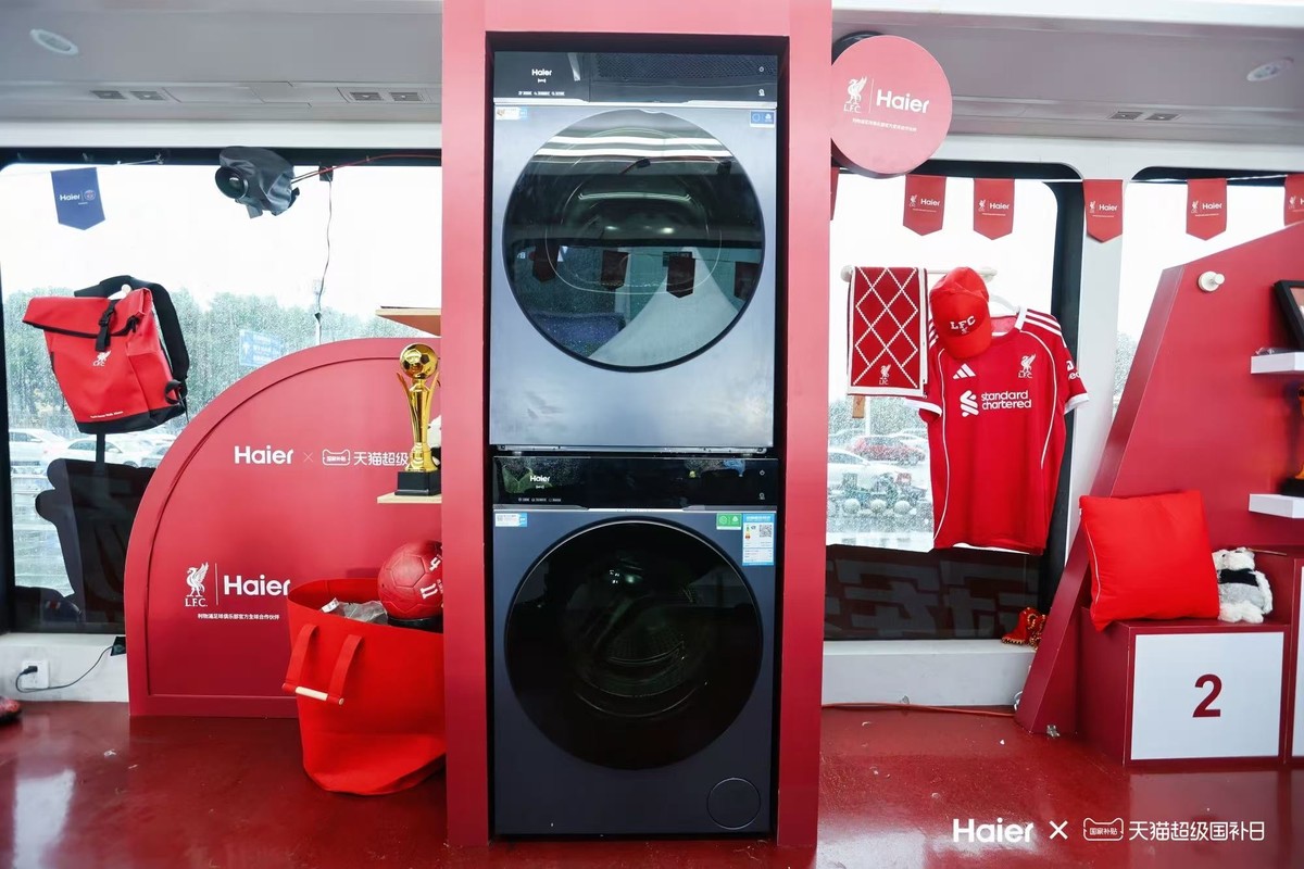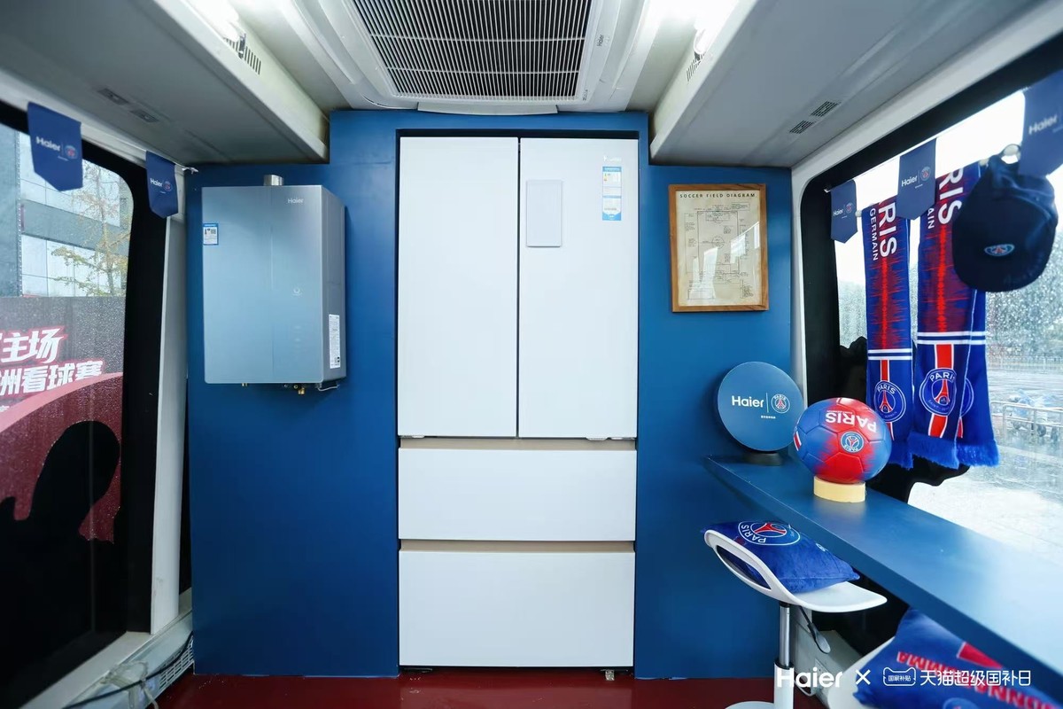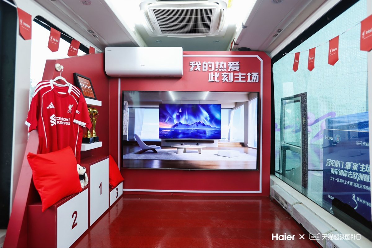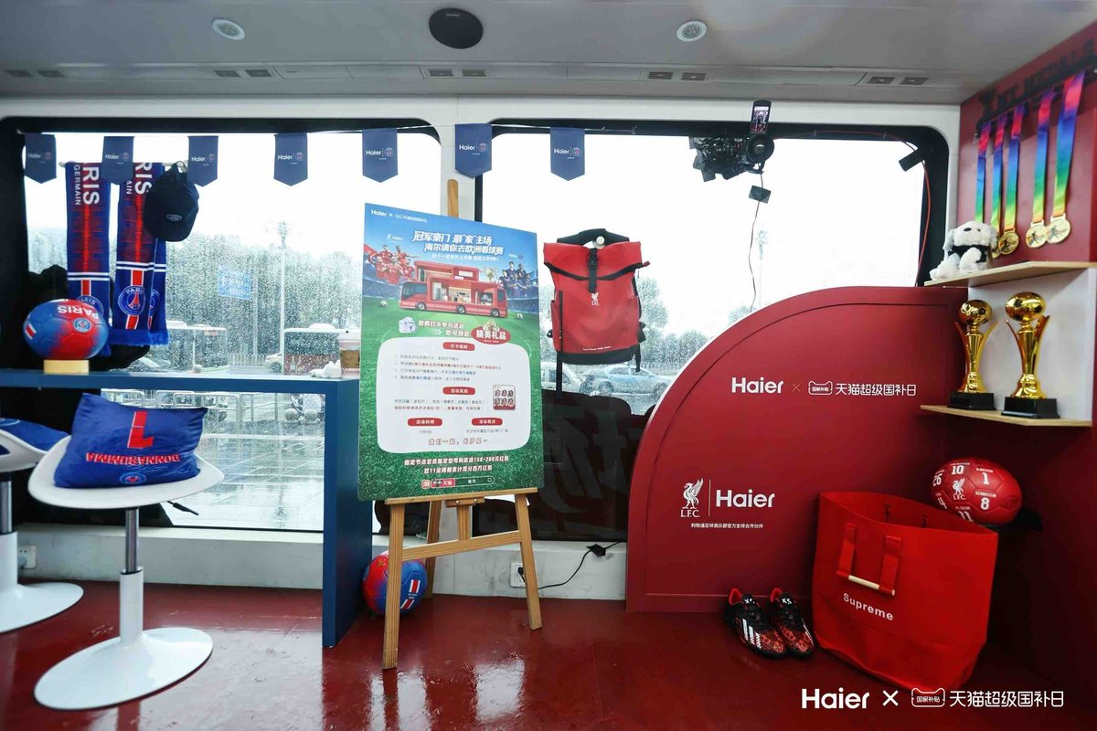 11月8日的长沙,一辆承载着海尔冠军单品的冠军球队豪华大巴车,缓缓穿梭于橘子洲头、太平街、五一广场等热门景点。大巴车身铺满利物浦和巴黎圣日耳曼球员的高清画面,内部则被打造成一个沉浸式的“球迷之家”。车厢内,球队旗帜悬挂两侧,经典球衣陈列其中,冠军奖杯复刻模型与历史荣耀时刻简介依次排开,营造出浓厚的俱乐部文化氛围。海尔云溪4.0pro洗烘套装、全空间保鲜冰箱、双循环燃气热水器等冠军产品,巧妙融入这一空间,与球迷文化元素相得益彰。